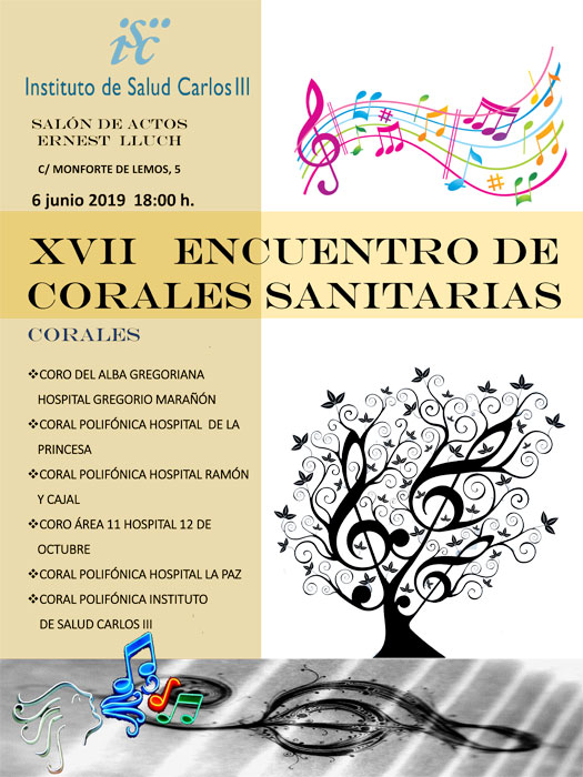 El próximo día 6 de junio, jueves, se celebrará el XVII  Encuentro de Corales Sanitarias de la Comunidad de Madrid. Este año la organización del mismo ha sido realizada por el Instituto de Salud Carlos III, donde se celebrará un concierto en el que participarán los coros de los Hospitales Gregorio Marañón, Ramón y Cajal, 12 de Octubre, La Paz, el anfitrión Instituto de Salud Carlos III y el Coro del Hospital de La Princesa. Será en el salón de actos Ernest Lluc, a las 18 horas.