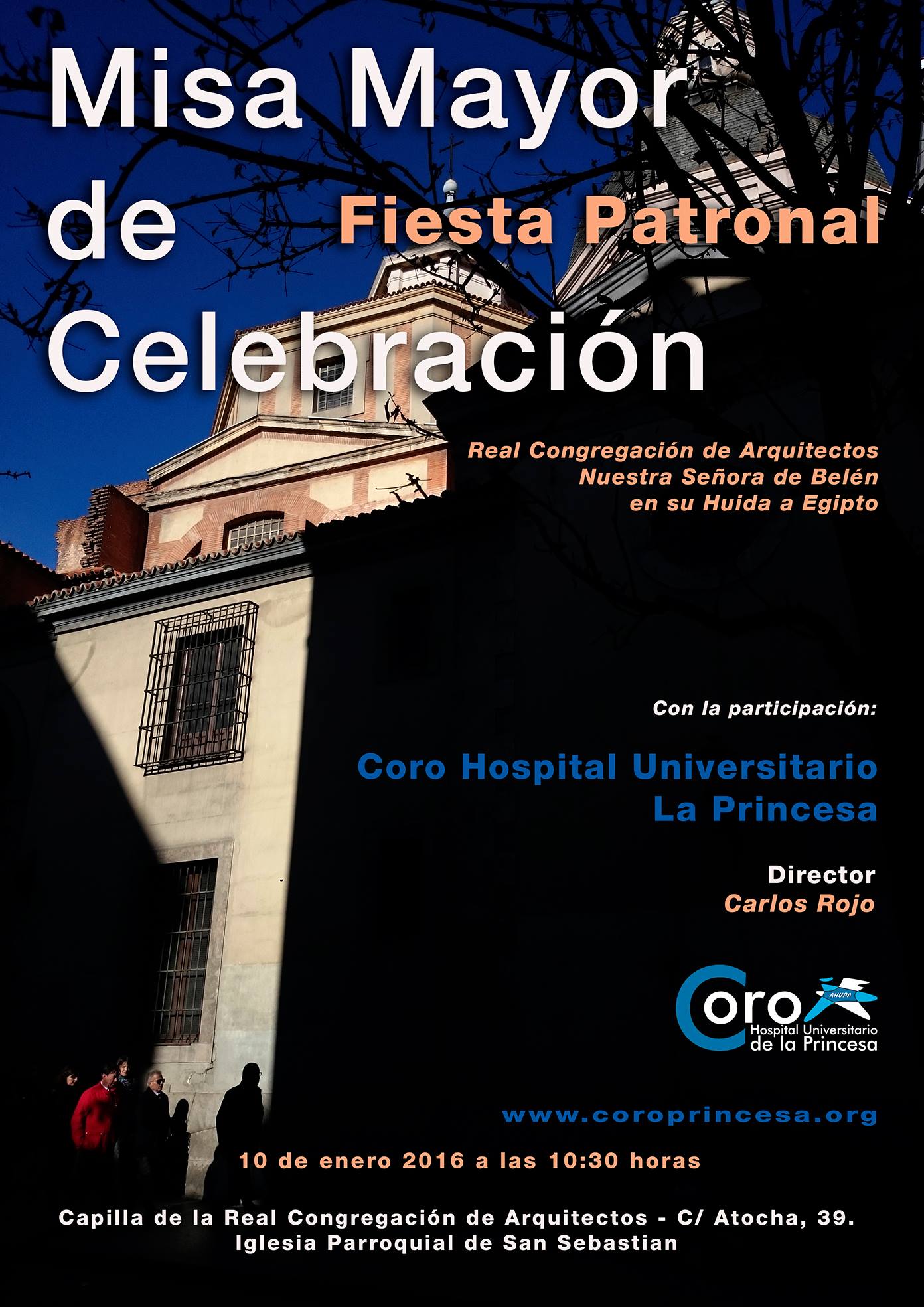 El próximo domingo día 10 de enero, se celebrará la Misa Mayor de Celebración de su Fiesta Patronal, en la Capilla de la Real Congregación de Arquitectos. Cantará el Coro del Hospital Universitario de la Princesa. Iglesia de San Sebastián, calle Atocha , 39, a las 10.30 horas.