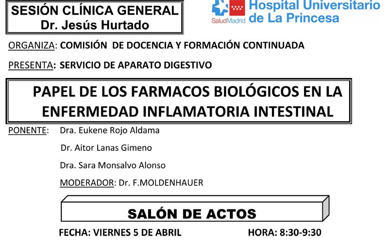Sesión Clínica 05 de Abril – Papel de los fármacos biológicos en la enfermedad inflamatoria intestinal Publicado por Ahúpa | 05/04/2019 | Actividades, Conferencias | 0 | No os perdáis la nueva sesión del viernes a las 8:30 en el salón de actos.