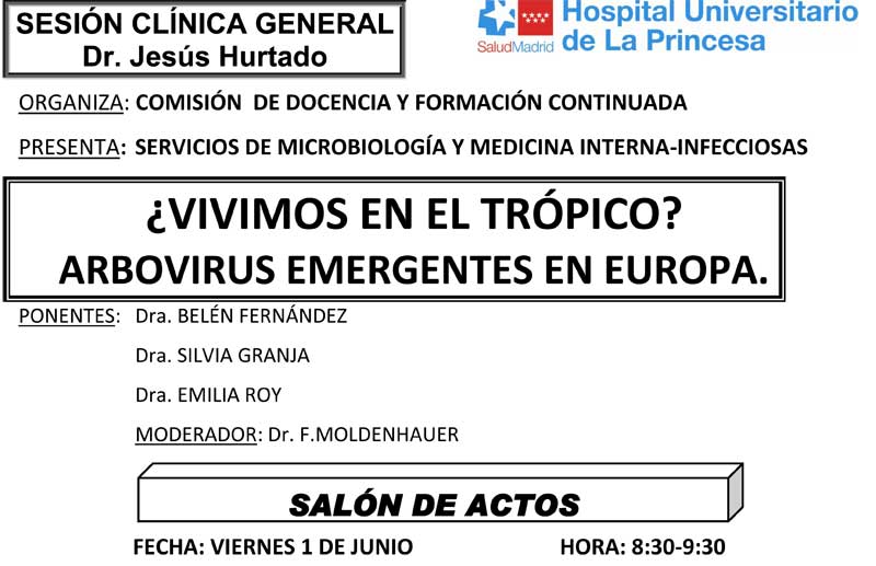 Sesión Clínica 1 de Junio – ¿Vivimos en el trópico?, arbovirus emergentes en europa Publicado por Ahúpa | 01/06/2018 | Actividades, Conferencias | 0 | No os perdáis la nueva sesión del viernes a las 8:30 en el salón de actos.