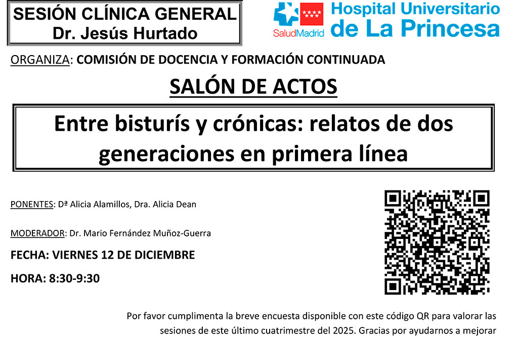 Sesión Clínica 12 de diciembre – Entre bisturís y crónicas: relatos de dos generaciones en primera línea Publicado por Ahúpa | 12/12/2025 | Actividades, Conferencias | 0 | Nueva sesión de este viernes de 8:30 a 9:30 –