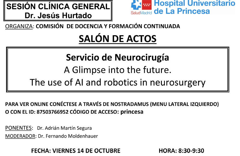 Sesión Clínica 14 de octubre – The use of AI and robotics in neurosurgery Publicado por Ahúpa | 14/10/2022 | Actividades, Conferencias | 0 | Nueva sesión de este viernes de 8:30 a 9:30 – Conéctese a través de Nostradamus con el id: 87503766952 Código de acceso: princesa