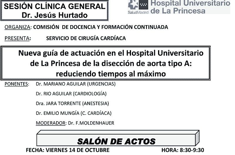 Sesión Clínica 14 de Octubre – Nueva guía de actuación en el Hospital Universitario de La Princesa de la disección de aorta tipo A: reduciendo tiempos al máximo Publicado por Ahúpa | 14/10/2016 | Actividades, Conferencias | 0 | No os perdáis la nueva sesión de este viernes a las 8:30 en el salón de actos.