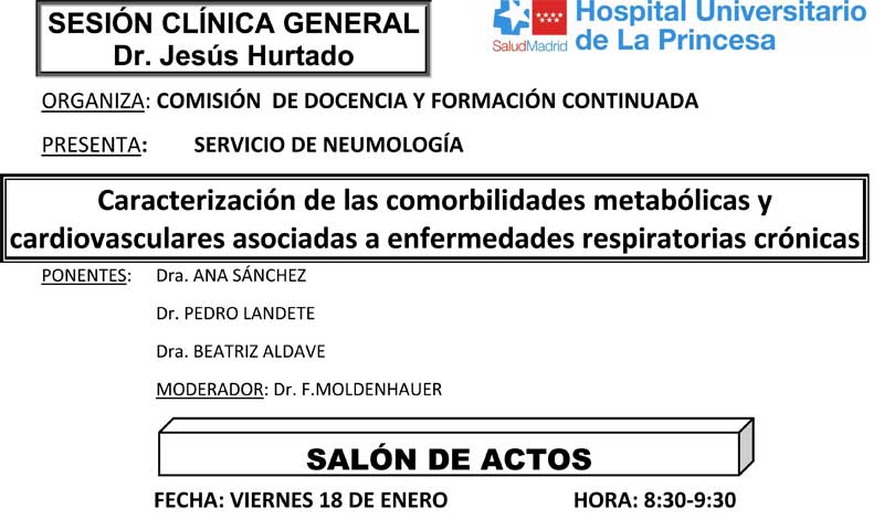 Sesión Clínica 18 de Enero – Caracterización de las comorbilidades metabólicas y cardiovasculares asociadas a enfermedades respiratorias crónicas Publicado por Ahúpa | 18/01/2019 | Actividades, Conferencias | 0 | No os perdáis la nueva sesión del viernes a las 8:30 en el salón de actos.