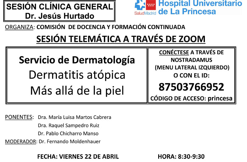 Sesión Clínica 22 de abril – Servicio de Dermatología – Dermatitis atópica, más allá de la piel Publicado por Ahúpa | 22/04/2022 | Actividades, Conferencias | 0 | Nueva sesión de este viernes de 8:30 a 9:30 – Sesión telemática a traves de ZOOM. Conéctese a través de Nostradamus con el id: 87503766952 Código de acceso: princesa