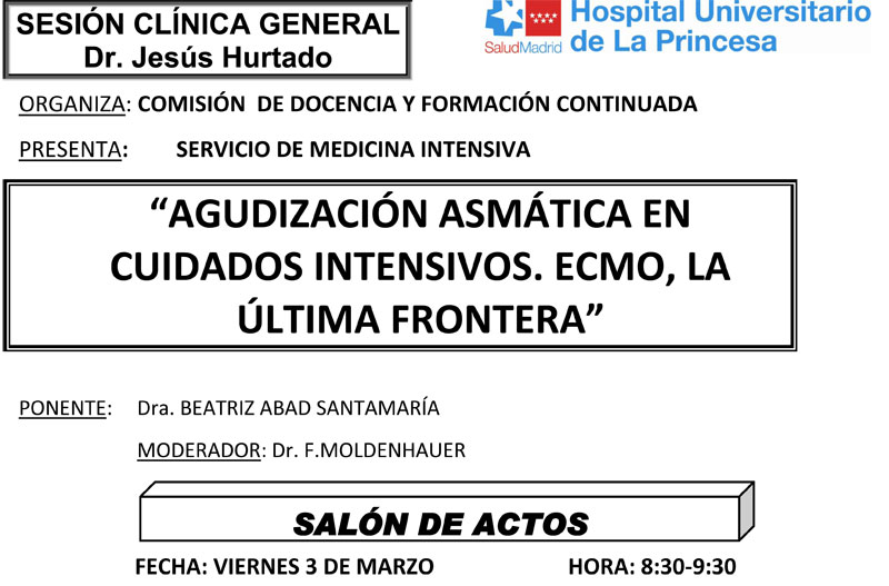 Sesión Clínica 3 de Marzo – Agudización Asmática en cuidados intensivos, ecmo, la última frontera Publicado por Ahúpa | 03/03/2017 | Actividades, Conferencias | 0 | No os perdáis la nueva sesión del viernes a las 8:30 en el salón de actos.
