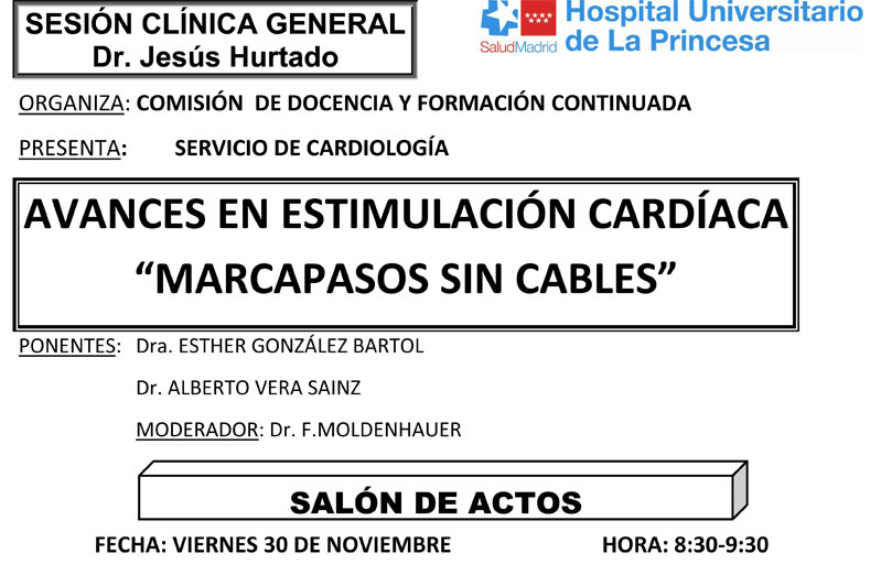 Sesión Clínica 30 de Noviembre – Avances en estimulación cardíaca “marcapasos sin cables” Publicado por Ahúpa | 30/11/2018 | Actividades, Conferencias | 0 | No os perdáis la nueva sesión del viernes a las 8:30 en el salón de actos.