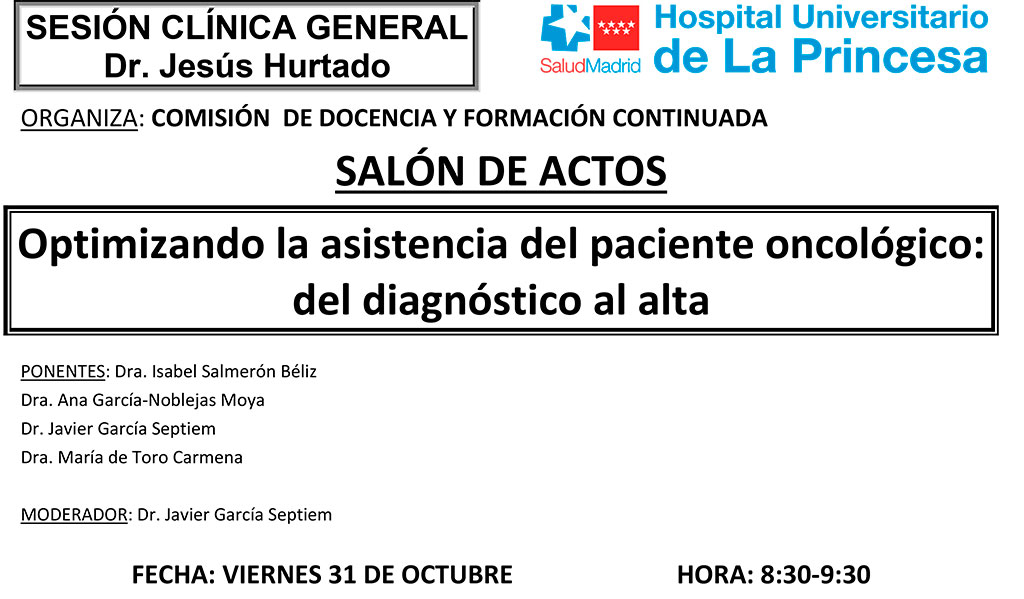Sesión Clínica 31de octubre – Optimizando la asistencia del paciente oncológico: del diagnóstico al alta Publicado por Ahúpa | 28/10/2025 | Actividades, Conferencias | 0 | Nueva sesión de este viernes de 8:30 a 9:30 –