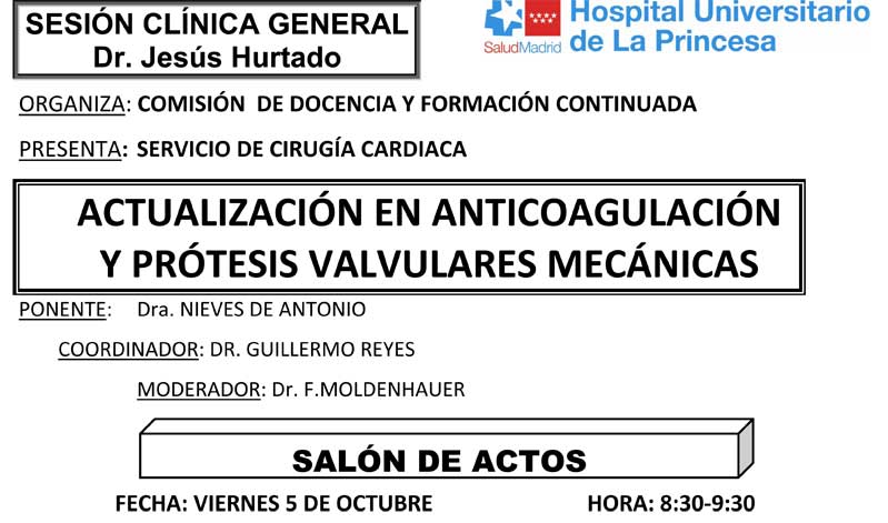 Sesión Clínica 5 de Octubre – Actualización en anticoagulación y prótesis valvulares mecánicas Publicado por Ahúpa | 05/10/2018 | Actividades, Conferencias | 0 | No os perdáis la nueva sesión del viernes a las 8:30 en el salón de actos.
