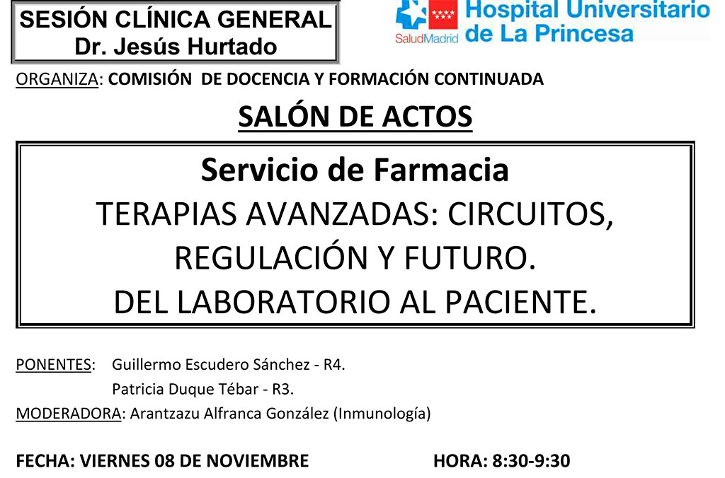 Sesión Clínica 8 de noviembre – Servicio de Farmacia – Terapias Avanzadas: Circuitos, regulación y futuro. Del laboratorio al paciente. Publicado por Ahúpa | 08/11/2024 | Actividades, Conferencias | 0 | Nueva sesión de este viernes de 8:30 a 9:30 –